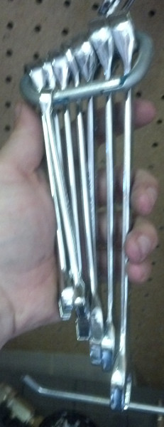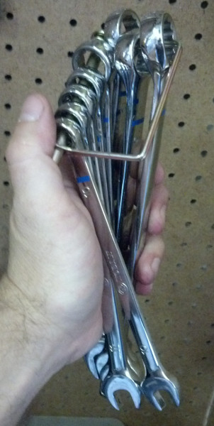 A carabiner also works as a way to store and organize boxed end wrenches. They are a bit more cumbersome than the hitch pins for getting the wrenches on and off. But, you can pick them up about anywhere. Heck I've even seen them in convenience stores. You don't need a super strong one. Just one that quality enough that the spring loaded latch doesn't fly off.